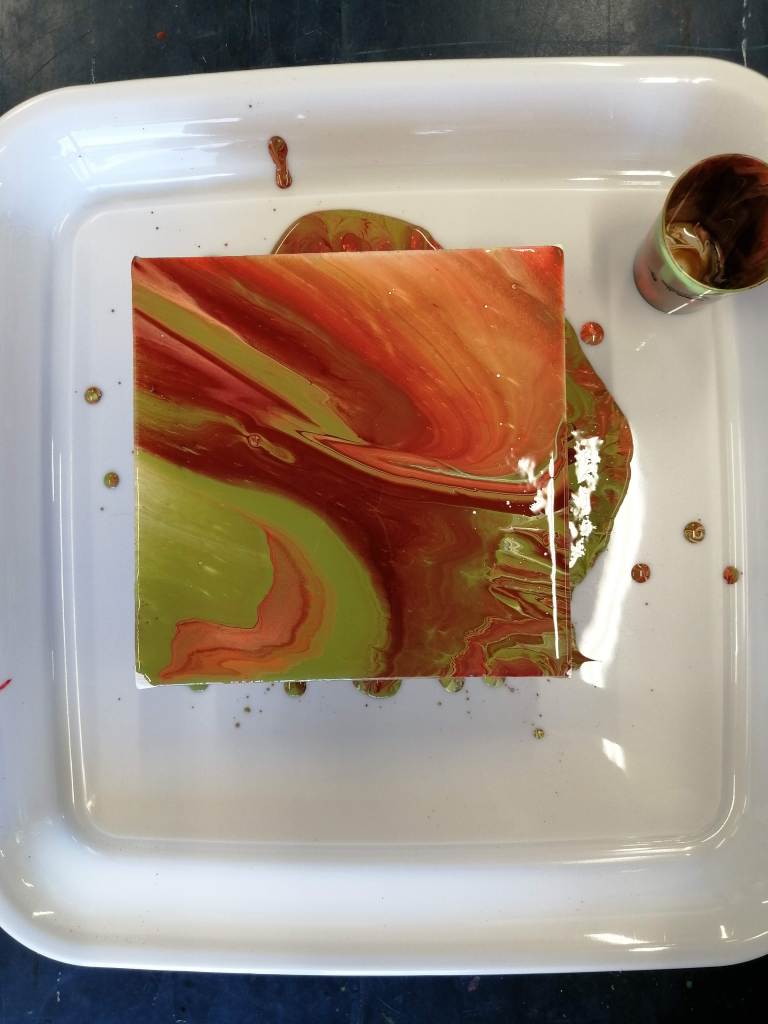Today we begun exploring unconventional methods of applying paint. Adding Floetrol to thin the paint without losing colour intensity like you would from adding water. We then filled a glass, put canvas on top and tipped over then released the paint from the cup lifting it up.