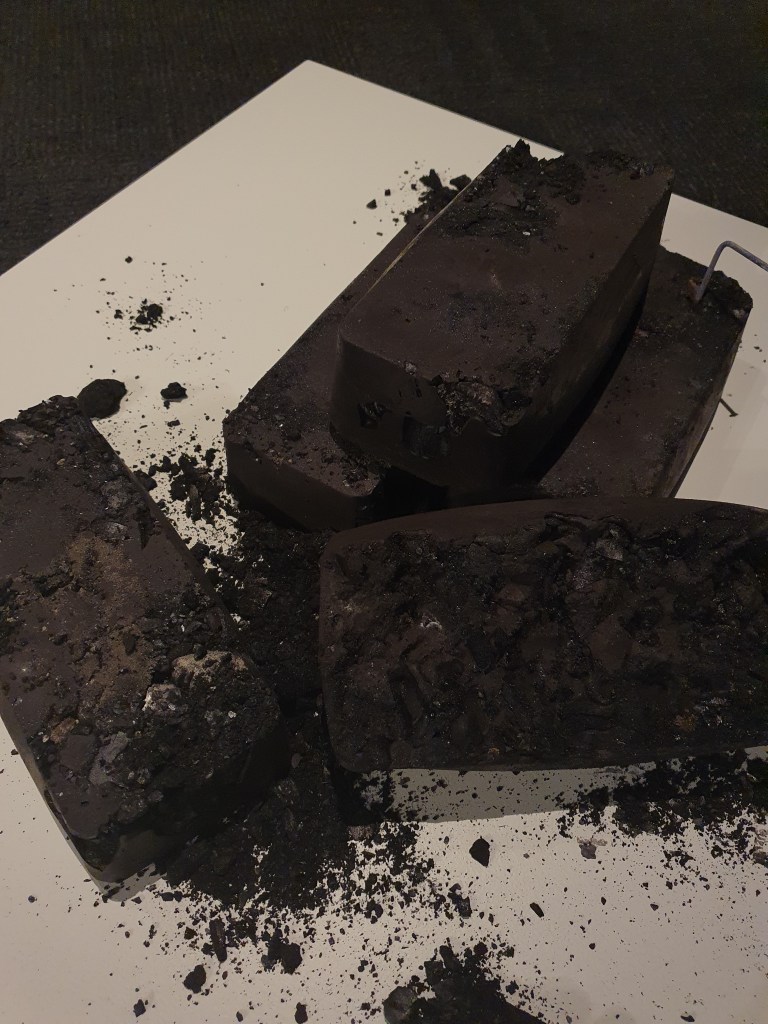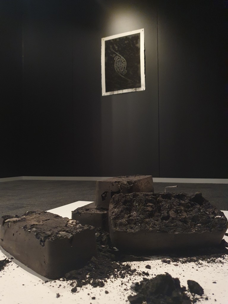 These charcoal forms are modelled from a typical brick you might find at a retirement village, they are about defending the sacred, specifically, Opihi Whanaungakore urupā that local iwi, Ngāti Awa are fighting to protect.