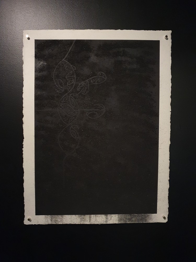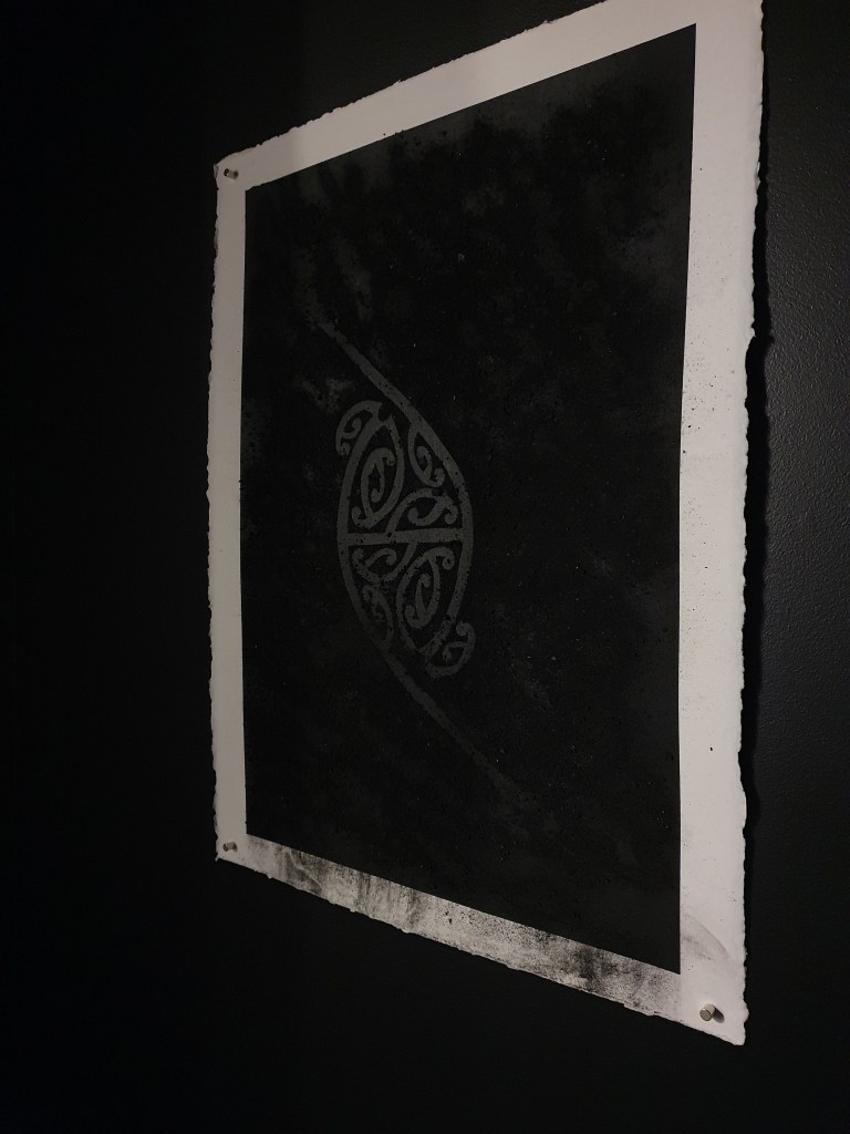 These prints, although not exhibited, were the beginning of the process to the final works. For 30 days I applied charcoal differently to paper and then reflected on my day with a kupu Māori. Applications included rubbing, soaking, leaving buried in a local reserve, sitting in the shallows of the awa, amongst the 30 methods of application. They seemed to feel the emotions of the kupu. Some were dusty, some were 3d. The important thing was that I remembered how helpful it can be exploring, making something small, making often, making without purpose apart from to make.