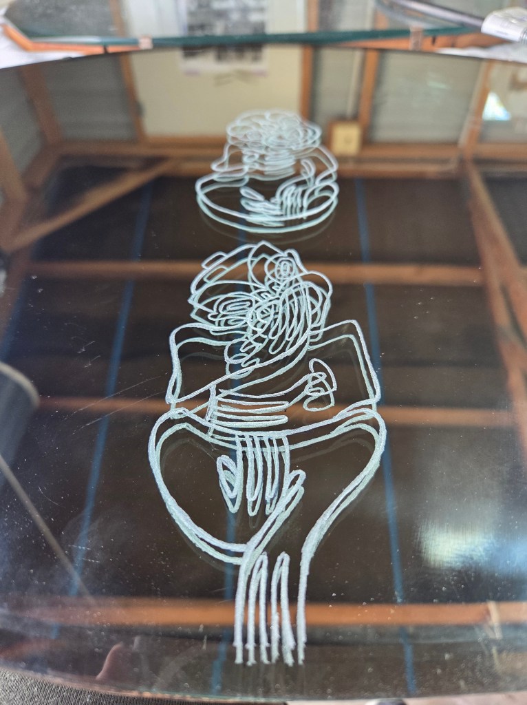 I sent part of my 1835 series (read more about this kaupapa here) and a sneak peek for one of my shows later in the year an engraved recycled mirror (You will have to wait to hear more about hat in September).