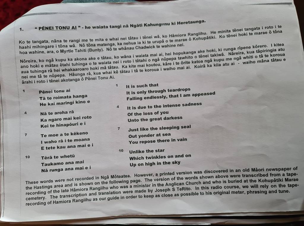 Although the kaitito of this mōteatea is not 100% certain, it identifies by all recorded information that it was composed from within Ngāti Kahungunu ki Heretaunga. The interpretations, although slightly differing, all have the similar meaning behind them. I am drawn to the symbolism within the interpretations: A lonely seal. Intense weeping, aching memories and inconsolable grief. The twinkling star, does it mock the mourners, light the path for the dead, or give hope by shining in a clear sky?