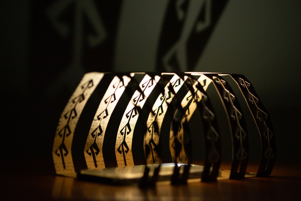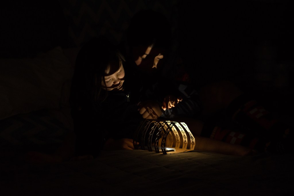 I wanted to get children involved in making their own family a space to wānanga, so it is a work they help to create. It comes flat and precut, to easily send to those whānau living faraway from their tūrangawaewae. Once made, and taken into a dark room, place a mobile phone with the torch light on inside the whare, to project the look of heke (rafters) from the customary Maori house. Tamariki can see that size does not matter, what matters is the spirit within that can shine out. My tamariki have loved including this in our nighttime routine, they gained a new confidence to recite their pepeha, karakia and waiata. It also calms them right down before sleep and makes a much more interesting environment for storytime.