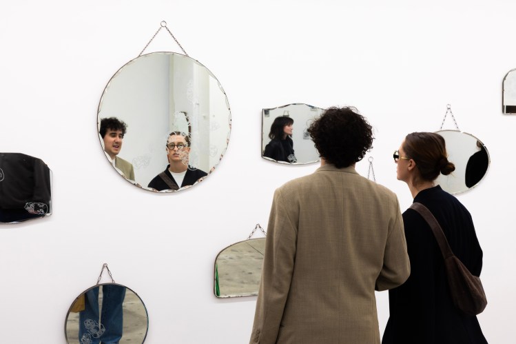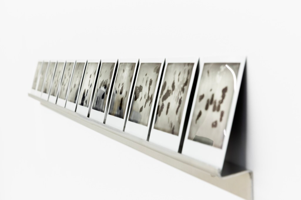 The engravings on these mirrors, much like the engraving on Russell’s skin, represent tūpuna Māori. Inspired by an exhibition of pounamu in which many hei tiki were displayed alongside the label ‘iwi unknown’, each engraved hei tiki here is an ancestor. Russell honours them by seeing them and in turn, letting them see us. In this series of artworks, these unknown ancestors have a home”.
